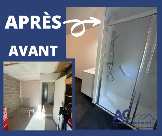 Lieu du chantier : Aube (10) Durée du chantier : 3 semaines Réaménagement d’une chambre (avec agrandissement) pour la création d’une douche PMR démolition d’une cloison repose d’une cloison enduit peinture pose bac à douche pose de faïence paroi de douche robinetterie et meuble pose de vinyle au sol La totalité des travaux sont réalisés…